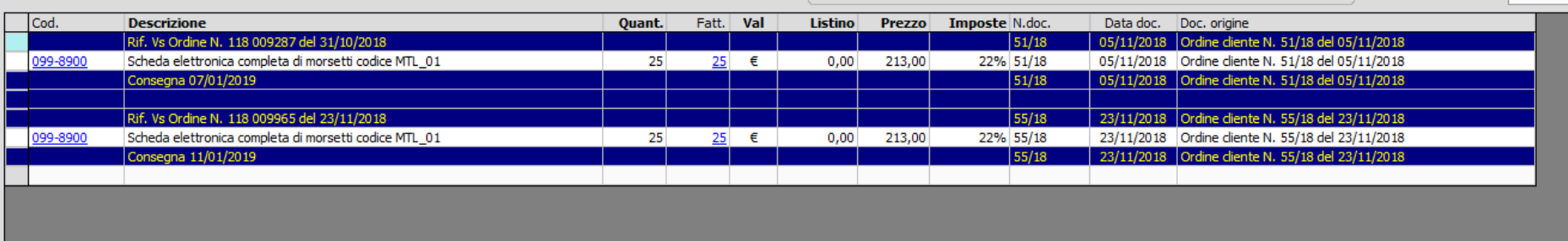 Nella prima foto si vede che il DDT proviene da due ordini diversi. Qui poi ho aggiunto solo la linea separatrice. Nella seconda foto la fattura ha ereditato tutte le linee descrittive del DDT oltre ad avere acquisito un proprio riferimento al DDT stesso. In questo caso quindi la fattura è venuta fuori in automatico tutta dal DDT senza ulteriori aggiunte di linee descrittrici.