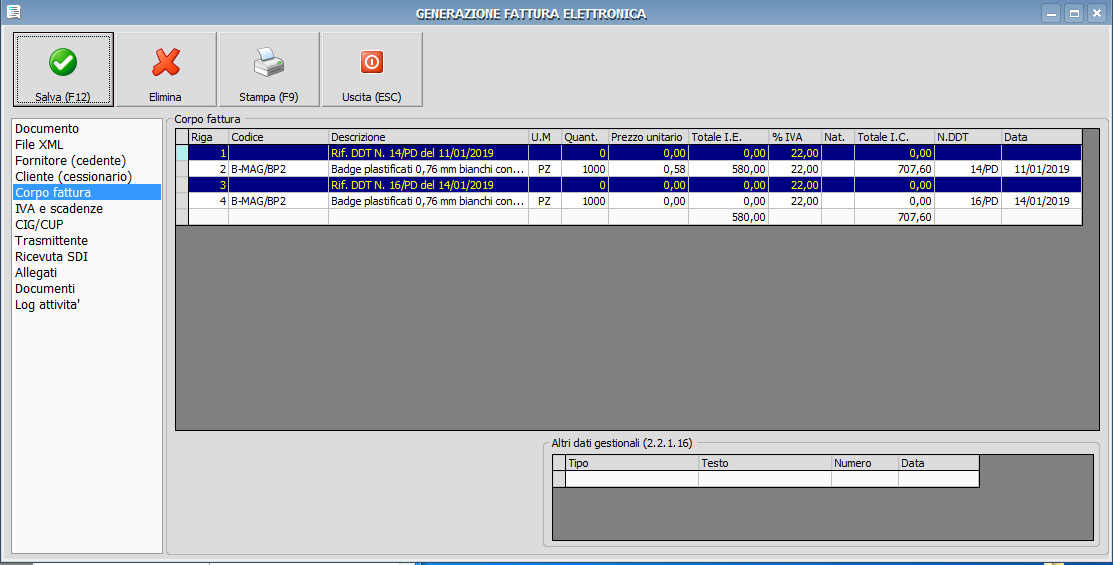 Dovendo generare una unica fattura elettronica da due ddt, nello stesso mese per un unico cliente, abbiamo seguito una strada manuale che non so se sia quella corretta. Dopo aver creato la prima fattura dal DDT tramite il pulsante 'Converti', ReadyPro ha generato sulla fattura una riga automatica con la dicitura 'Rif. DDT N. XXX del 11/01/2019'. Per chiudere anche il secondo DDT abbiamo modificato manualmente il rigo in questo modo 'Rif. DDT N. XXX del 11/01/2019 e N. YYY del 15/01/2019'. Ho paura però che poi non vengano inseriti tutti e due i rif. del DDT quando si crea la fattura elettronica. C'è eventualmente una più idonea procedura da seguire? Grazie