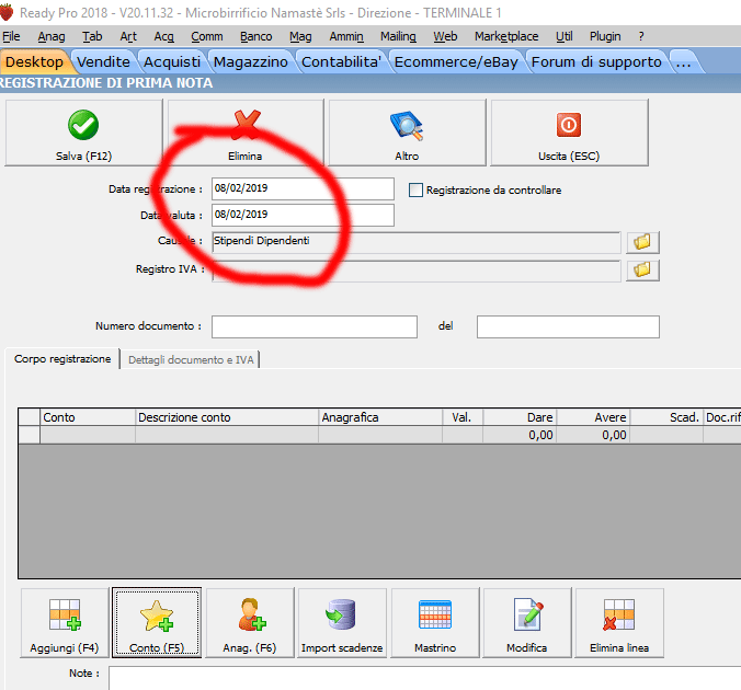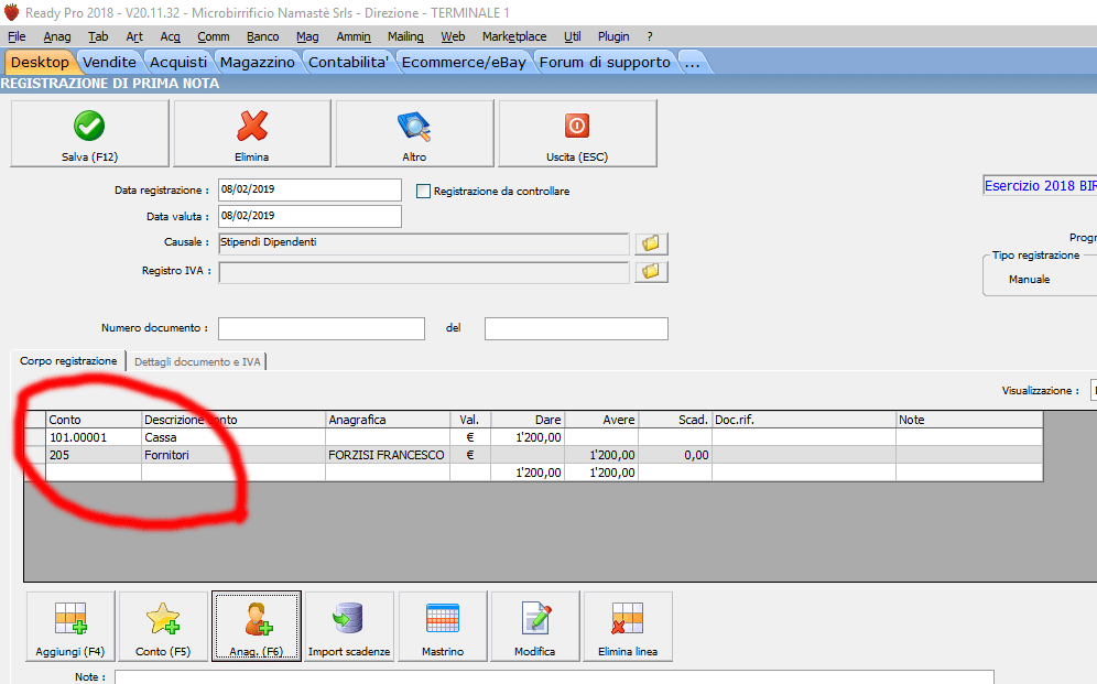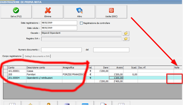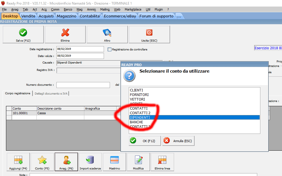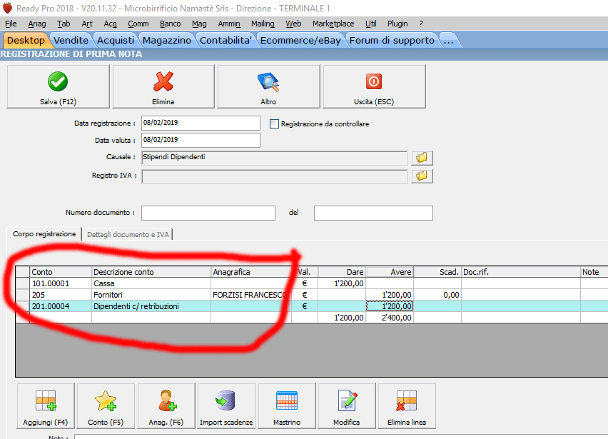 Se inserisco il conto mastrino 201.0004 Dipendenti c/retribuzioni non ho la possibilità di associare l'anagrafica del dipendente al quale pago lo stipendio.