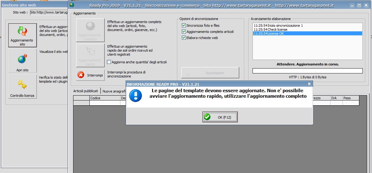Salve, oggi dopo aver effettuato tutti gli aggiornamenti a Readypro, sono andato sulla sezione web per scaricarmi gli ordini web. Ho cliccato su aggiornamento rapido, ma Ready mi dice che non posso effettuare l'aggiornamento rapido e che devo utilizzare l'aggiornamento completo. Ora io posso anche cliccare su aggiornamento completo, ma non vorrei che facendo in questo modo vado a modificare tutta una serie di informazioni tra i quali le foto dei prodotti o altri dati degli articoli. Potreste darmi maggiori delucidazioni in merito?. Grazie. Saluti.