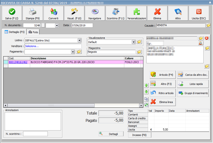 Quindi potreste creare una stampa con l'importo (non necessariamente fatta con Ready Pro) da rilasciare al cliente. E quando il cliente dovesse poi tornare per un acquisto potreste semplicemente incassare 5,00 euro in meno del totale della ricevuta (che sono poi i 5,00 euro che non avete rimborsato nel reso sopra) Ma come ripeto e' una cosa che va gestita a mano