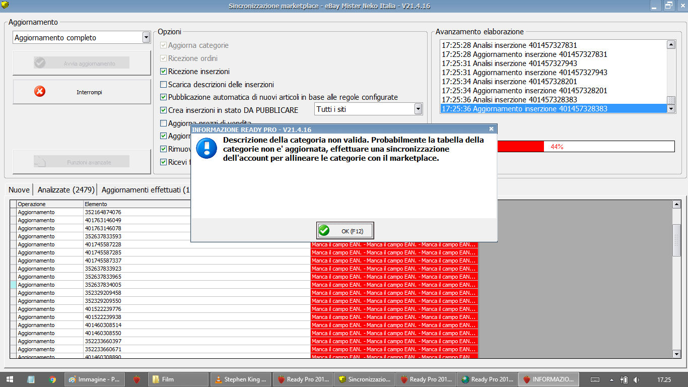 eBay tra ieri ed oggi ha aggiornato oggi le categorie. Dovresti selezionare la categoria corretta per queste inserzioni dalla nuova tassonimia Prima forza un aggiornamento delle categorie nel modo indicato nello screenshot cosi' da essere sicuro di avere in Ready Pro la tassonomia aggiornata all'ultima versione