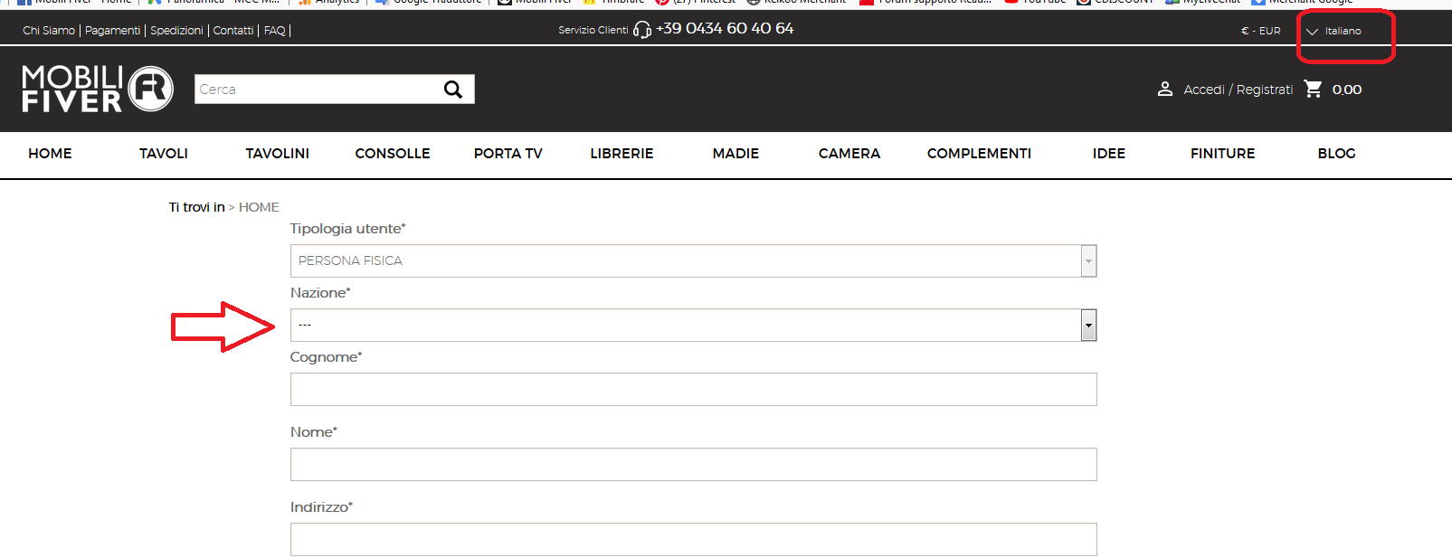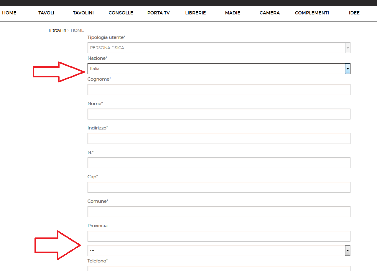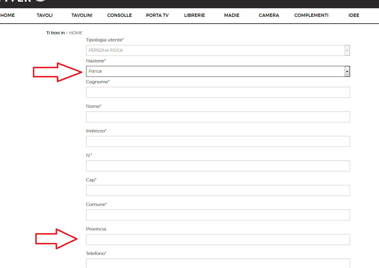Buongiorno, ho alcune domande per la fase di registrazione del utente su sito e-commerce: 1) su nazione: è possibile impostare di default Italia se la lingua è italiana (vedi allegato). tipo francese-> Francia, tedesco-> Germania, spagnolo-> Spagna, inglese-> UK. Poi cmq l'utente può scegliere un'altra nazione, ma almeno è già inserito se vuole usare quella (lo facilitiamo). 2) se la nazione è IT: compaiono 2 campi provincia, invece in ita dovrebbe essere solo a "tendina". cmq uno è da togliere perchè crea solo confusione. Mentre se la nazione non è IT compare solo un campo da compilare (vedi allegati). 3) è possibile mettere un blocco di caratteri nei campi (es. nel indirizzo metter un blocco a X caratteri inseriti)? grazie