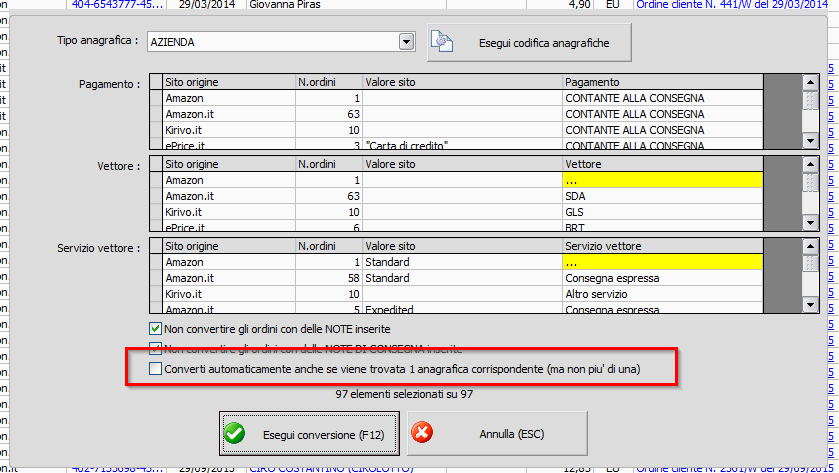 Tempo fa in una tele-assistenza avevo chiesto il motivo perché nella scheda conversione documenti di ebay, ma anche con Amazon, gli ordini di clienti già in anagrafica non li converte e li sospende con la dicitura: Trovate 1 possibili corrispondenze in anagrafica, la risposta del tecnico è stata che i due ordini avevano delle differenze. Avendo controllato spesso questo problema posso affermare che avvolte è vero il cliente cambia indirizzo ma avvolte no, l'indirizzo è identico.