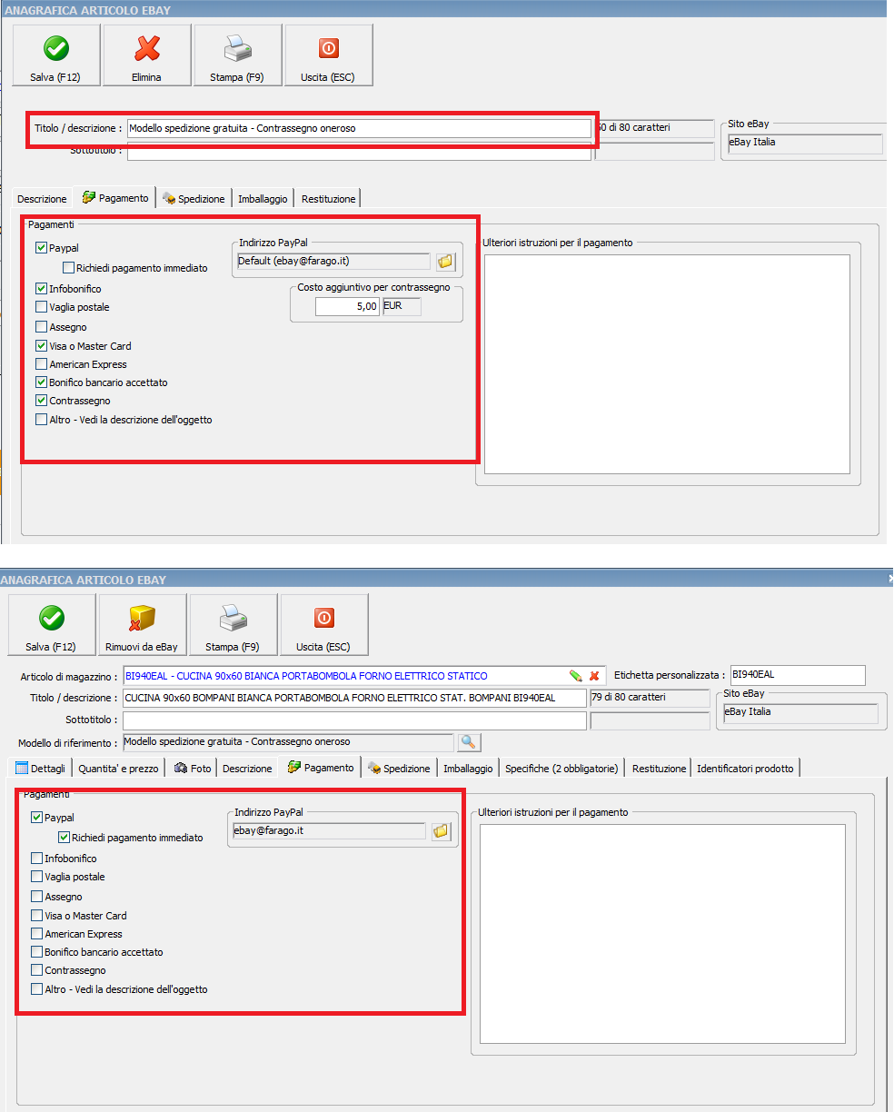 Citazione: Inoltre, dalla schermata che mi hai indicato, segnala errore costo contrassegno non indicato, ma c'è.... E' normale purtroppo. Come cercavo di spiegare all'inizio il contrassegno e' gestito da eBay solo in combinazione con le spese di trasporto e quindi NON e' aggiornabile successivamente. Quindi il contrassegno in ogni caso massivamente non c'e' modo di attivarlo (a parte il fatto che tutti i consulenti eBay sconsigliano proprio di utilizzarlo come forma di pagamento, ma questa e' un'altra storia)