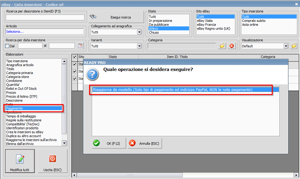 Citazione: ma anche da rigenera da modello dall'articolo stesso Dentro le inserzioni non esiste un pulsante per rigenerare i pagamenti della singola inserzione. Avete premuto il pulsante per rigenerare qualcos'altro (descrizione, spese di trasporto, o altro). Ma in quella sezione "Pagamenti" non esiste un pulsante per rigenerare da modello