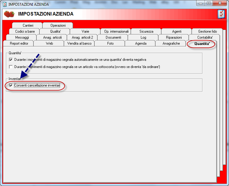 Citazione: io ho ancora l'inventario del 30-12-11, come faccio a ripristinare il magazzino con quel inventario per il momento Se vuoi eliminare l'inventario devi prima entrare in UTIL > IMPOSTAZIONI AZIENDA > QUANTITA' come indicato nel mio screenshot e successivamente entrare in MAG > INVENTARI DI MAGAZZINO, selezionare l'inventario del 30.12.11 e premere su ELIMINA: