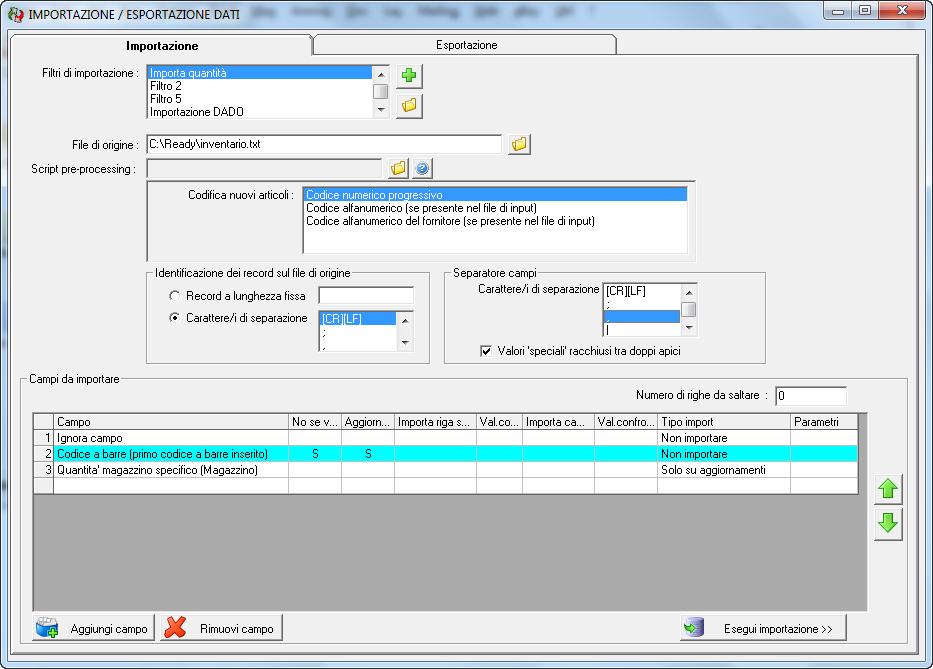 Citazione: non posso rifare l'inventario... auguro che mi capiate... Come già scritto su questo thread: http://www.readypro.it/aiutooo.10.0.86078.fo.aspx mostraci come hai configurato il filtro di importazione ed eventualmente allegaci il file che hai creato con il BCP-7000.
