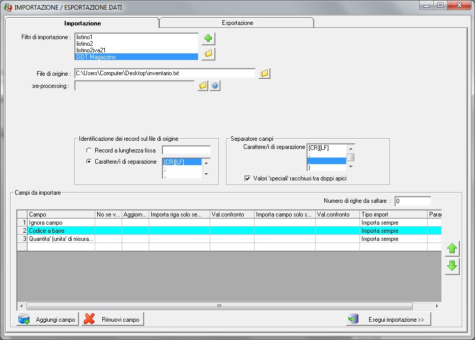 Puoi mostrarmi uno screenshot di come hai creato il filtro di importazione? Vedo dal file che mi hai allegato che comunque ci sono alcuni errori, dovuti probabilmente ad una lettura di un nuovo codice a barre prima di confermare le quantità:
