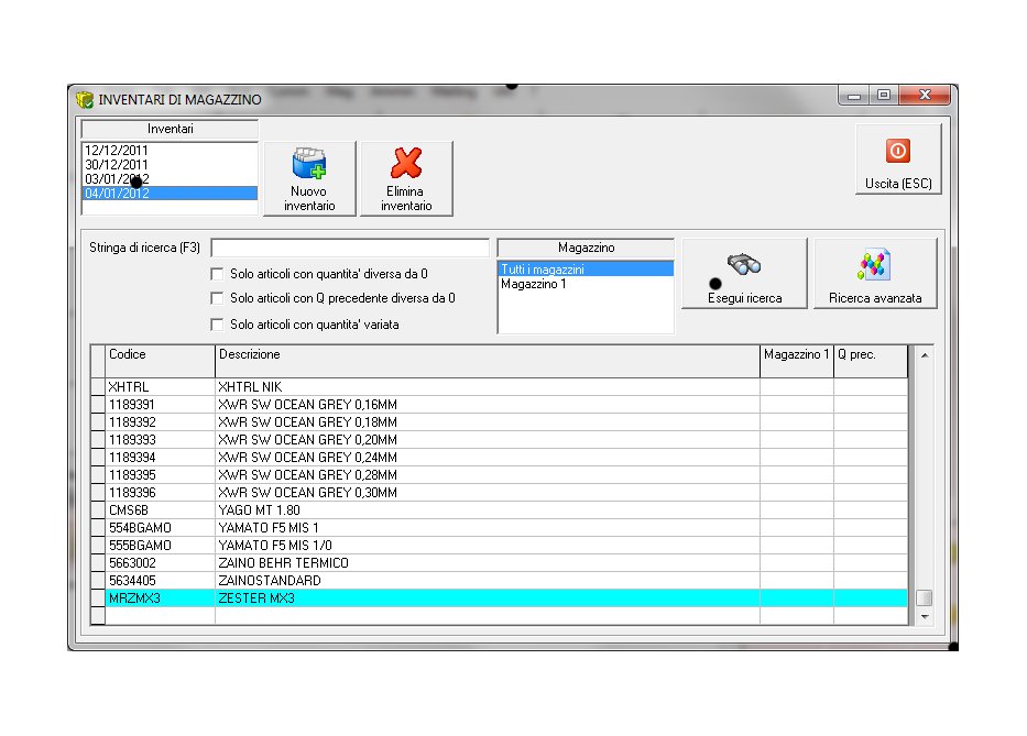 Purtroppo ora mi sorgono un paio di dubbi ed una domanda: - Perché hai creato altri inventari oltre al 30.12.11 con data 03.01.12 e 04.01.12? - Hai sempre selezionato l'opzione AZZERA TUTTE LE QUANTITA'? - Una volta creato quel filtro di importazione del corpo documenti in quale documento hai importato gli articoli e con quale data?