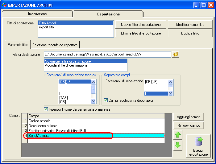 Come si vede, ho inserito nel filtro di export, due volte il campo Codice Articolo: all'inizio e alla fine del record.