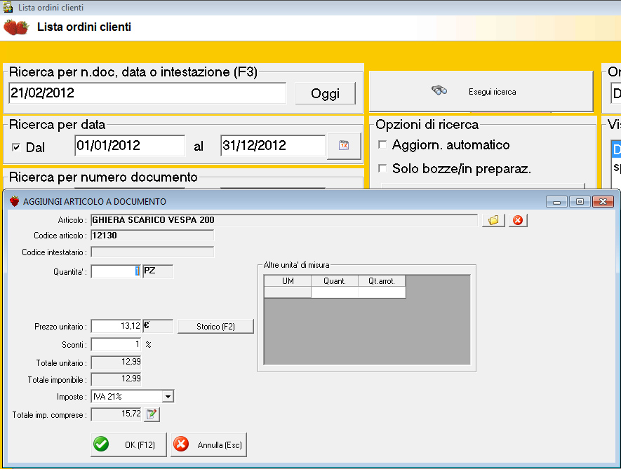 Buongiorno, sono qui a disturbarvi ancora per chiedervi come risolvere un problema di visualizzazione. Da ieri pomeriggio, quando vogliamo inserire un articolo all'interno di un ordine cliente, ci compare una finestra come quella che vedete in allegato. Prima ci compariva una finestra differente con tanto di foto dell'articolo in questione ed era decisamente più comodo. C'è modo di ripristinare la visualizzazione precedente? Da dove si accede per apportare le modifiche? Grazie ancora e buona giornata a tutti.