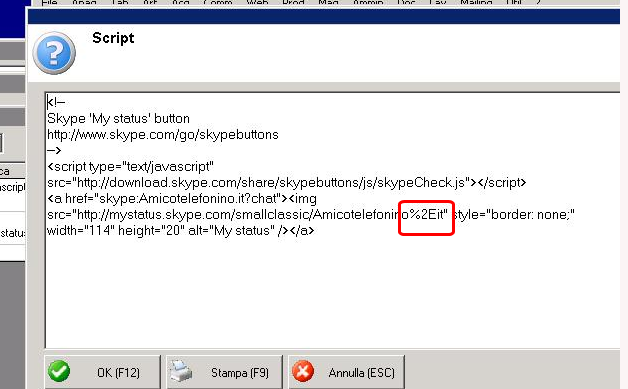 il problema è dovuto al tuo nome: amicotelefonino.it La procedura guidata di creazione del pulsante stato di Skype ha mal interpretato il PUNTO. Prova a modificarlo manualmente.