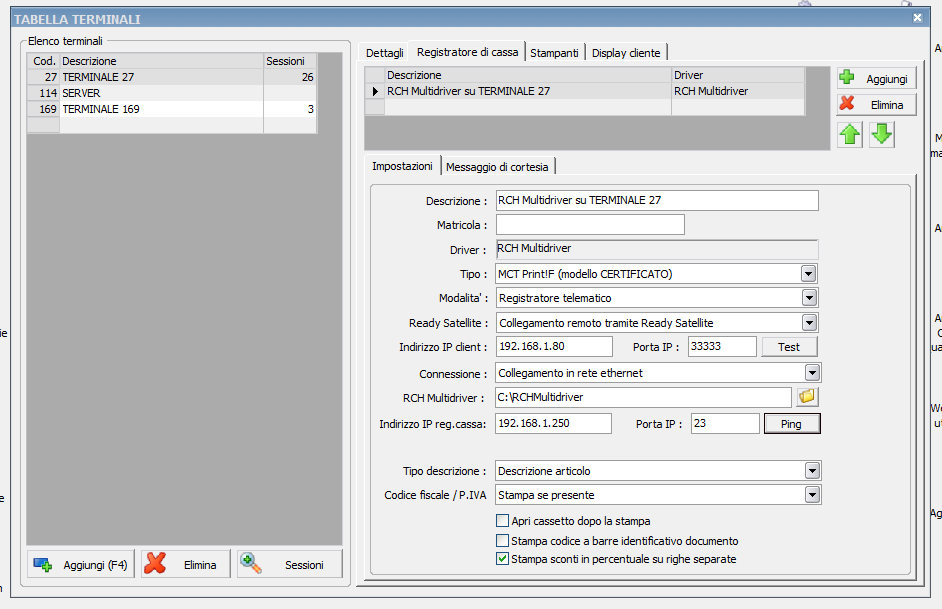 Potrebbe allegare uno screenshot di come e' configurato il registratore di cassa su TAB/TERMINALI? Stampate forse da remoto tramite Ready Satellite?