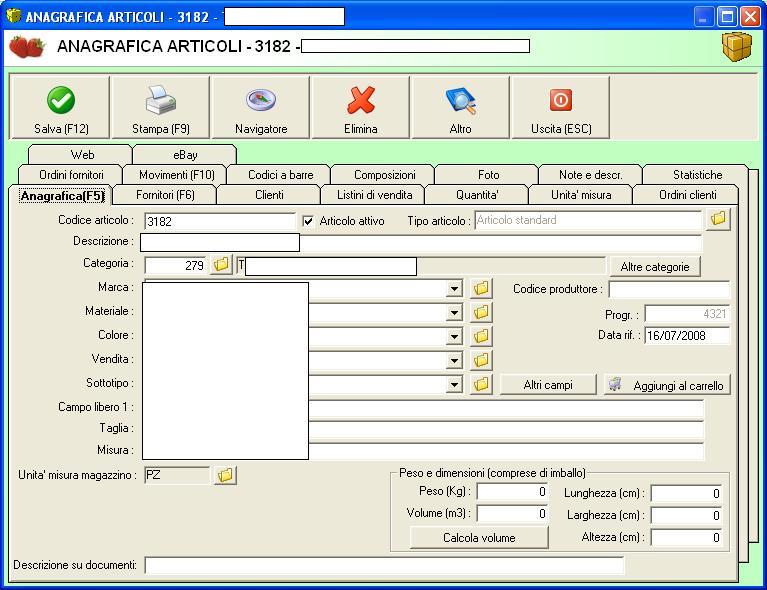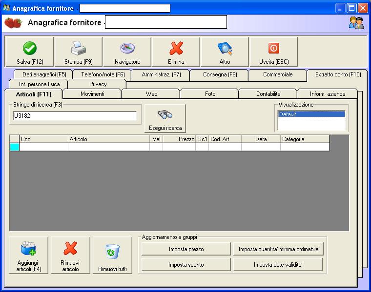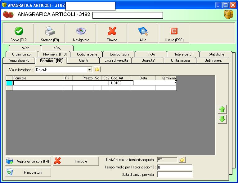 Ho un art. a cui ho dato, nell'anagrafica art., nell'esempio riportato il cod. 3182 (anag Fort), mentre, all'interno della stessa anagraf., nel campo fornit. ho dato il cod. U3182 (anag Fort2). Ora succede che se, all'interno dell'anagraf. fornitore/Articoli, cerco il suddetto art. con il cod. dato dal fornitore non ho nessun risultato (Anag Fort3). Per trovarlo devo inserire il cod. art. dato nella anagraf. art. Ovviamente succede anche per tutti gli art il cui cod. dato dal forn. č diverso dal cod. art. che ho impostato io. Mentre invece nella ricerca in "Lista Art." posso inserire o l'uno o l'altro art. per visualizzarlo. Aggiungo che la casella "Ricerca anche per codice fornitore", in impostazione azienda/Anag., articoli č spuntata.