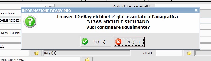 se invece attiviamo l’opzione per la creazione dell’anagrafica automatica, ready NON riconosce l’abbinamento e porta alla creazione di una nuova achea cliente. il collega poi magari la modifica, “formattandola” per bene(spesso i clienti sbagliano i campi) e poi, al salvataggio, appare l’avviso del 1° screen...