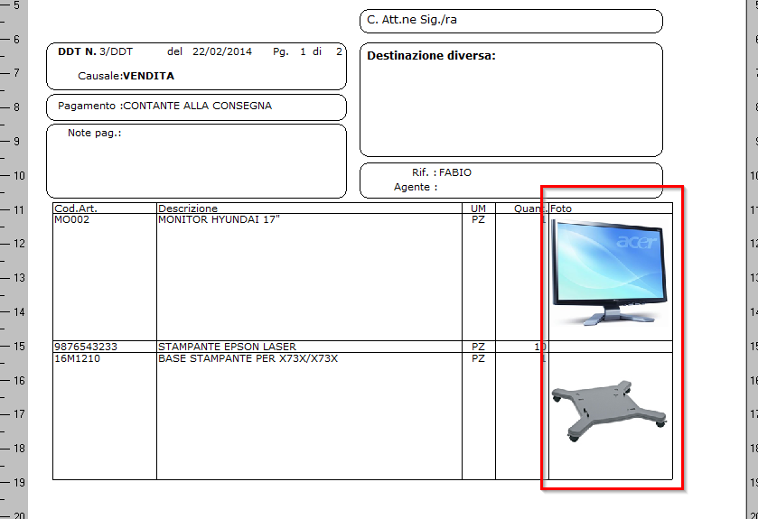 Intervenendo con degli script e' possibile stampare la foto di prodotti ma solo per documenti con un numero di prodotti ridotto. Ovvero e' possibile stampare la foto se il documento contiene 2-3 articoli, facendo stampare la foto in un'area del foglio lasciata libera appositamente. Ma una stampa che genericamente stampi la foto di tutti gli articoli (es. se il documento ne contiene 50) non e' possibile. E' comunque un tipo di stampa che va eventualmente personalizzato in teleassistenza essendo piuttosto particolare