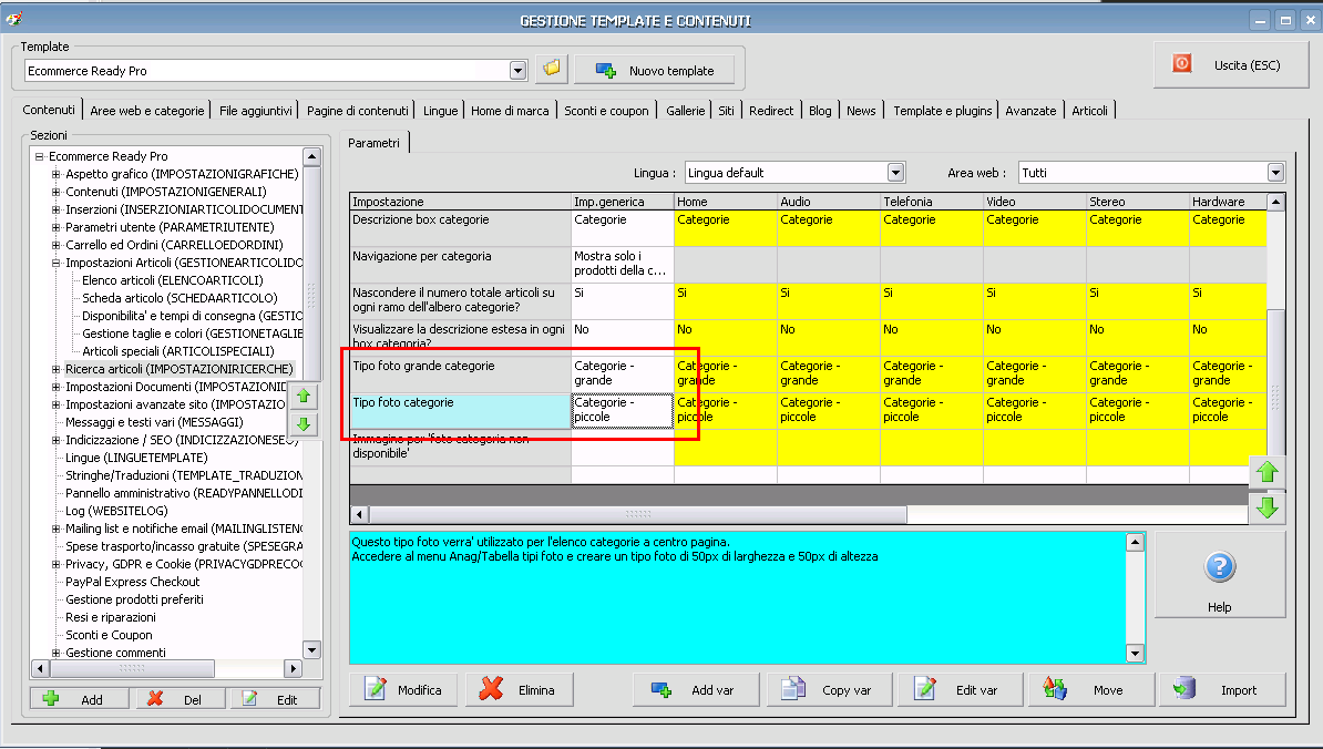 Citazione: La dimensione la crea Ready? Si, una volta creato il "tipo foto" corretto, come spiegato sul manuale https://www.readypro.it/help/it/729/visualizzazione-categorie-articoli-a-centro-pagina-con-foto-in-miniatura