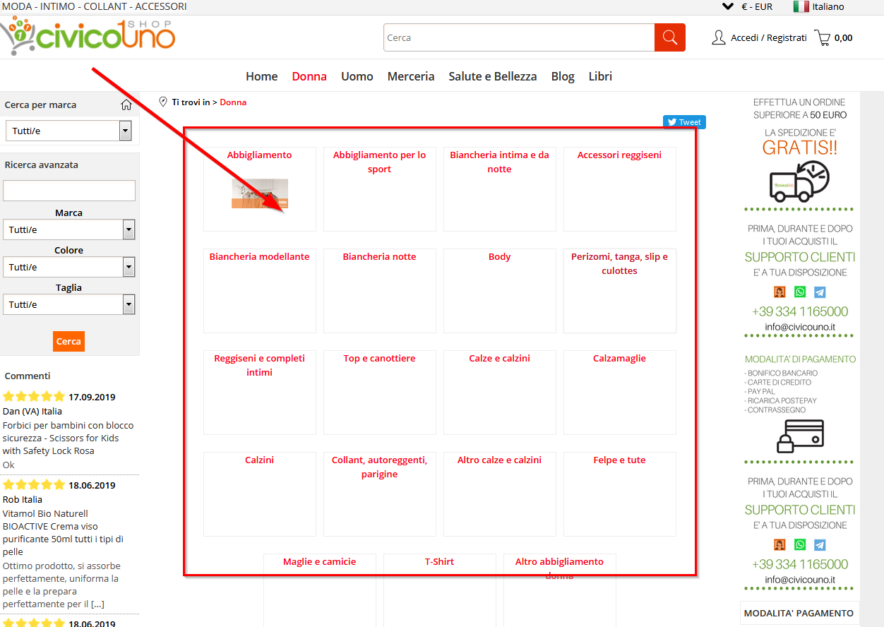 Citazione: Nella categoria Salute e bellezza cliccando sulla sottocategoria profumi mi esce fuori la pagina con descrizione e una foto, vorrei fare questa operazione per tutte le sottocategorie di Salute e bellezza Per questo punto (Descrizione e foto su home di categoria) ti chiederei di aprire un altro thread. Grazie