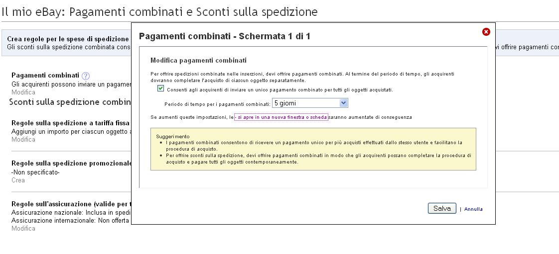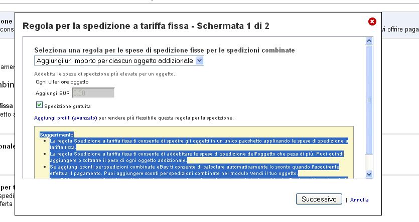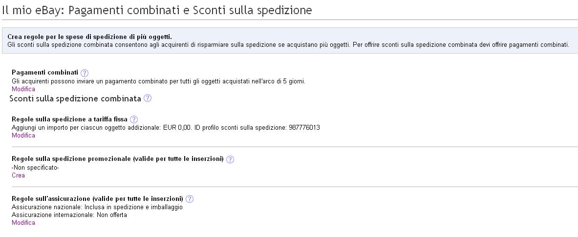 La regola Spedizione a tariffa fissa ti consente di spedire gli oggetti in un unico pacchetto applicando le spese di spedizione a tariffa fissa. La regola Spedizione a tariffa fissa ti consente di addebitare le spese di spedizione dell'oggetto che pesa di più. Puoi quindi aggiungere o sottrarre il peso di ogni oggetto addizionale. Se aggiungi sconti per spedizioni combinate eBay ti consente di calcolare automaticamente lo sconto quando l'acquirente effettua il pagamento. Puoi aggiungere sconti per spedizioni combinate nel modulo Vendi il tuo oggetto. I profili ti consentono di adattare alle tue esigenze le regole sugli sconti per le spedizioni combinate. Puoi specificare i costi di spedizione per ogni oggetto addizionale e l'oggetto non deve essere dello stesso tipo.