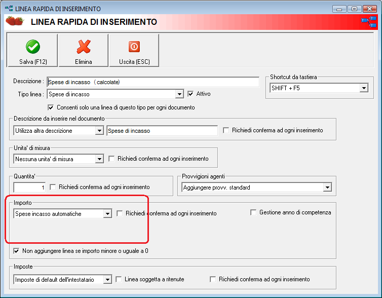 Quella che ti ho allegato io E' una schermata giusta Entra su UTIL / TIPI LINEE DOCUMENTI e rimetti a posto la configurazione del tipo "Spese di incasso (calcolate)"