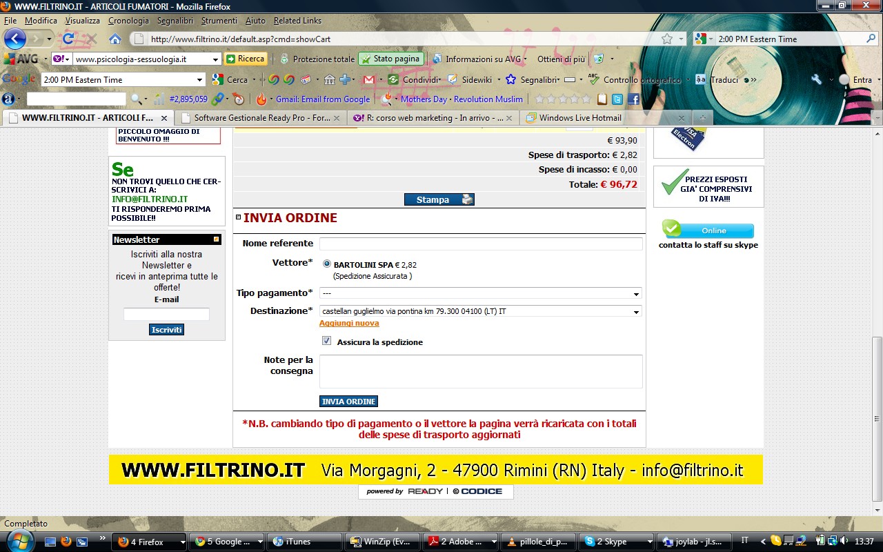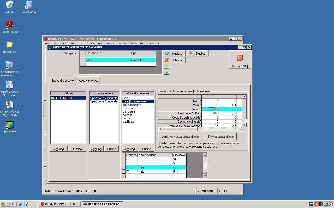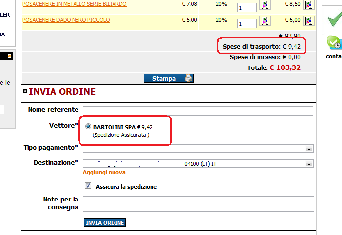 ok ora vi allego il tutto. scusami... non ci avevo pensato. allora il primo allegato riguarda l'ordine online fatto con il nome utente e password del cliente.. che è di latina. volevo inviarti lo screenshot delle spese di trasporto configurate ma non riesco da qui.. (sto lavorando da casa) ma ti assicuro che sono impostate bene. ho solo aggiunto alla voce COSTO(%dell'assicurazione) una percentuale. spero di trovare il modo per spedirti lo screenshot dal mio laptop. perchè sto lavorando collegandomi al server remoto ma non ha nemmeno la posta configurata.. quindi non lo posso nemmeno inviare alla mia casella di posta. ufff..