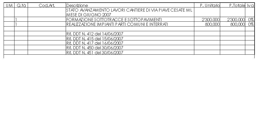 Per dei nostri "grossi" cantieri (tanti materiali e diversi mesi di mano d'opera) generalmente facciamo i classici ddt, fatturiamo il tutto in un'unica fattura mensile nella quale vorremmo mettere delle linee di testo in cui specifichiamo i lavori eseguiti, i ddt del mese e come unici prezzi solo dei prezzi a fianco alle voci dei lavori eseguiti concordati col cliente. Per non far stampare gli articoli sulla fattura nessun problema, ma vorrei forzare il prezzo totale senza che mi venga ricalcolato nulla. Provvisoriamente ho inserito uno sconto pari al totale dei ddt ed inserito un prezzo a fianco alle voci dei lavori eseguiti.