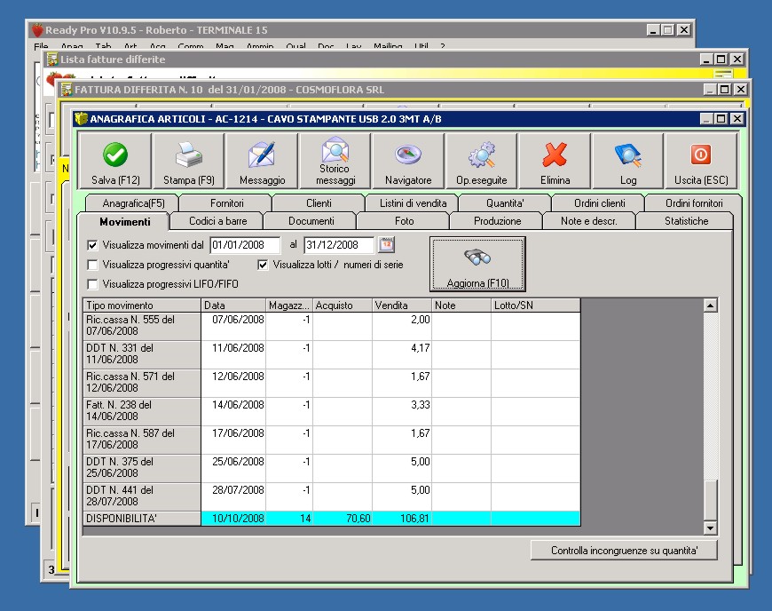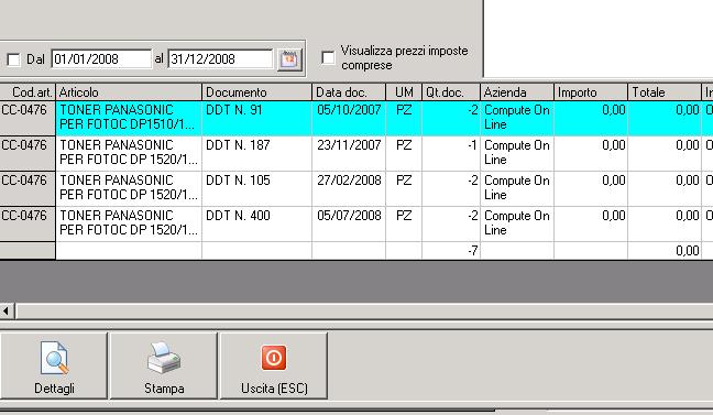 durante la fatturazione ai clienti si presenta spesso la necessità di avere un riscontro dei prezzi degli articoli uguali venduti nei mesi precedenti , ora nei movimenti si può avere parzialmente questo ma non strutturato in modo da avere un quadro rapido di consultazione , infatti nella colonna di sinistra in grigio appaiono solo i numeri e date di fatturazione e non i dati anagrafici dei clienti costringendomi ad aprire decine di righe articolo sino ad " imbroccare " il cliente a cui sto fatturando , altro grosso problema se in bolla non si applica il prezzo , cosa molto frequente per evitare che i trasportatori possano vedere il valore dei prodotti , nello storico movimenti il prezzo rimane a zero anche dopo la valorizzazione ottenuta con la fatturazione differita