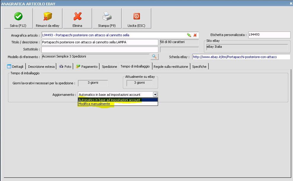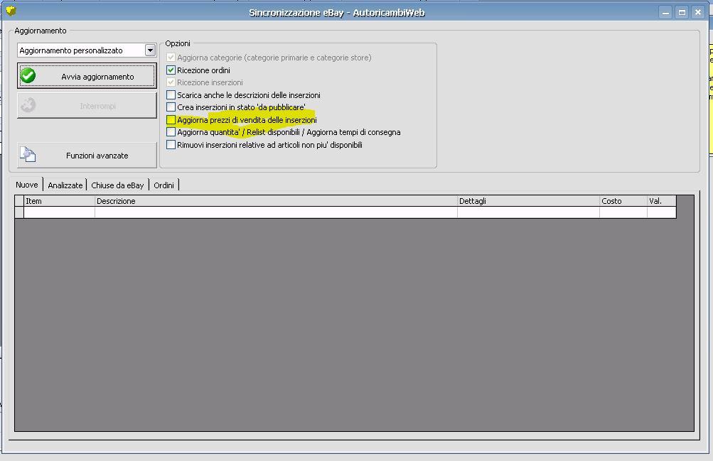 Da ciò che abbiamo capito quanto andiamo a lanciare la procedura di aggiornamento (vedi screen) non dovrebbero aggiornarsi le inserzioni su ebay, o perlomeno sul prezzo vi è apposita opzione, ma sul trasporto, i tempi di imballaggio, il template legato alla categoria.