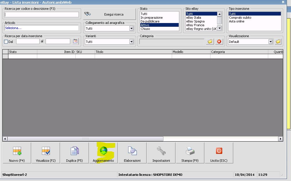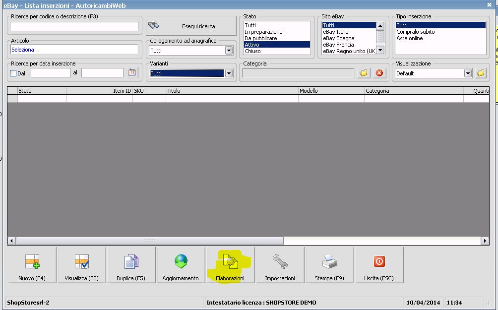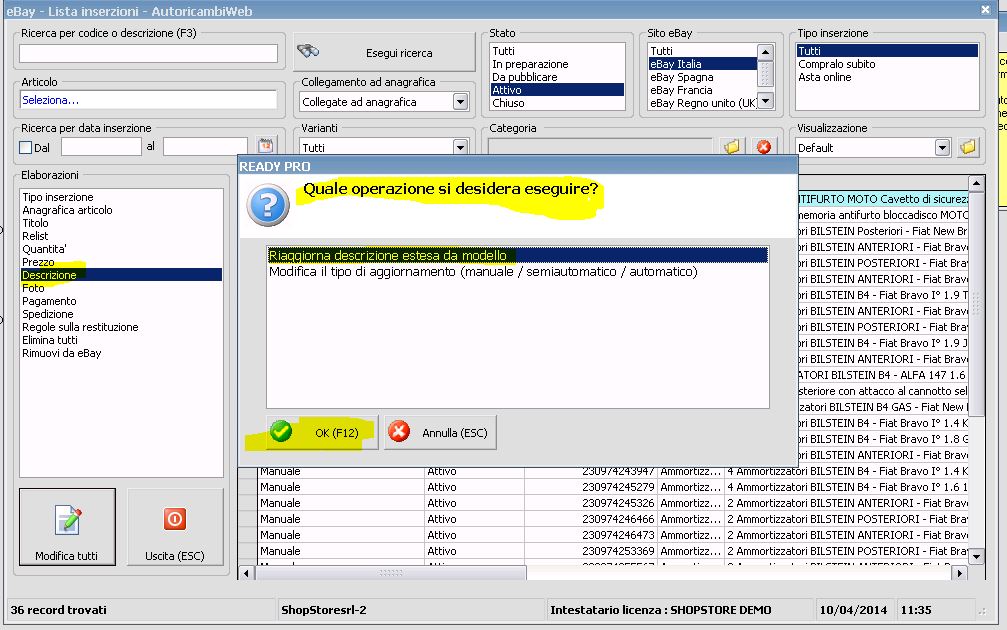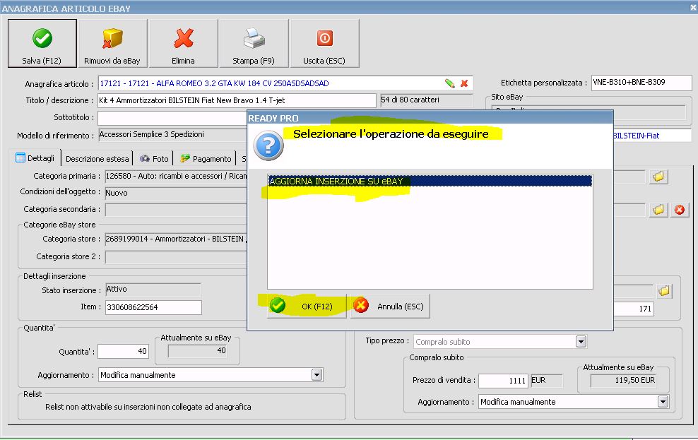 Le inserzioni su ebay si aggiornano solo ed esclusivamente in 2 modi: - Andando su singola inserzione e quando si salva il sistema chiede se volgiamo aggiornarla su ebay (vedi allegato). - Usando il pulsante elaborazioni dalla liste delle inserzioni scegliere le inserzioni che si desidera modificare e scegliere l'opzione che si desidera eseguire.