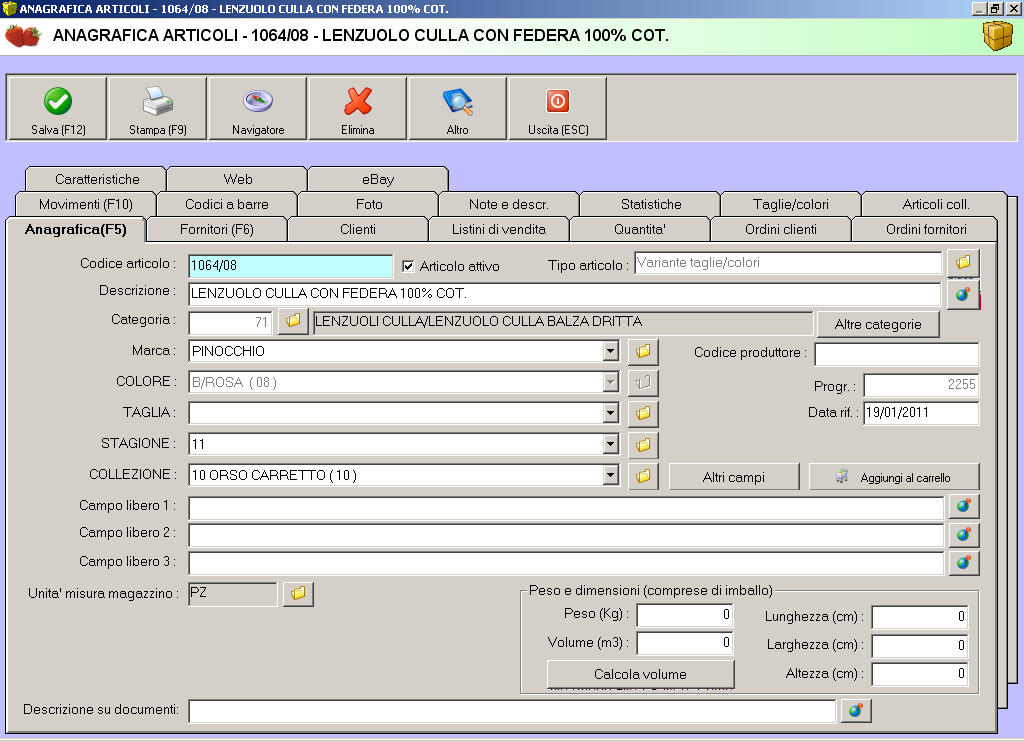 Per quanto riguarda invece il dato "Collezione", che immagino non faccia parte dei parametri della variante, il problema e' dovuto ad un errore di codifica. Nel caso di articoli in taglia/colore i primi 3 campi tabellari dell'anagrafica vanno lasciati riservati ai parametri di variante, quindi non dovreste utilizzarli se non per inserire le varie varianti di tagli e colori. Per inserire la collezione dovreste utilizzare un campo tabellare dal 4o in avanti come da screenshot (altrimenti poi la collezione viene visualizzato come parametro di variante sul sito, come infatti avviene)